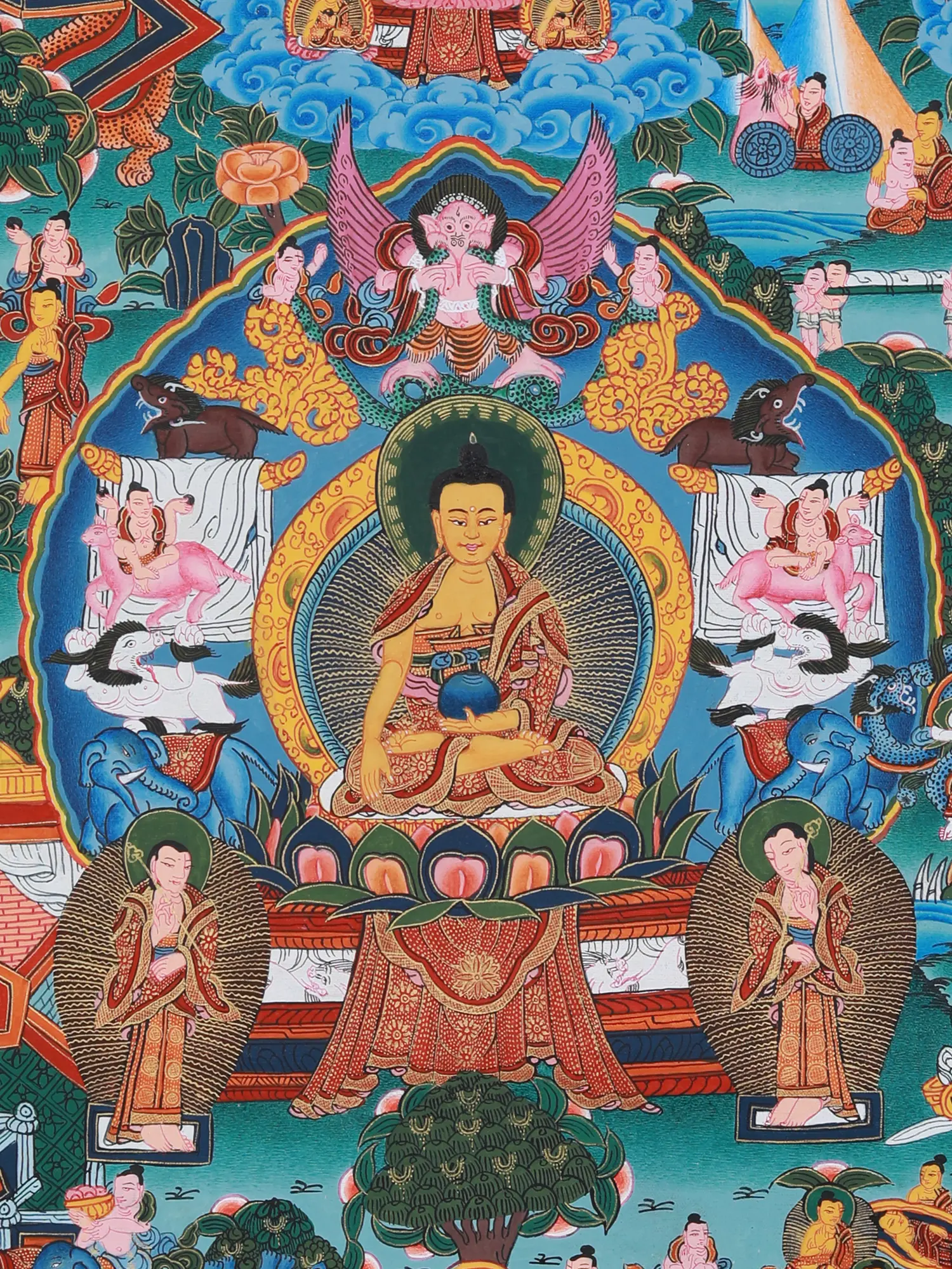 The painting depicts key episodes from the life of Siddhartha Gautama, from his luxurious upbringing as a prince sheltered from the suffering of the world, to his renunciation, his arduous path of asceticism, and finally, his attainment of enlightenment under the Bodhi tree. Witness his Great Departure, leaving behind the comforts of his princely life in search of truth; his encounter with the Four Sights – old age, sickness, death, and a renunciate – that shook his perception of reality; and his relentless pursuit of spiritual liberation through meditation and mindfulness. These scenes are not merely historical representations but potent symbols of the human journey towards self-discovery and transcendence. The details, even in the smallest figures, are replete with meaning, inviting contemplation and deeper understanding of Buddhist philosophy.A Symphony of Symbols and Iconography